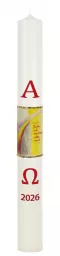 Diesen Bogen vom Anbeginn der Schöpfung bis zur von Gott verheißenen Neuschöpfung spannt auch die Künstlerin Stefanie Bahlinger in ihrer Grafik. Ganz konkret mit dem Regenbogen, der zuerst ins Auge fällt. Seit Anbeginn der Schöpfung, angedeutet durch die dunkle Fläche links im Bild, verloren die Menschen Gott immer wieder aus dem Blick. Das hindert Gott nicht, an seinem Bund, seinem Versprechen: „Ich bin da“, festzuhalten. Bis heute schreibt Gott seine Geschichte mit den Menschen weiter, auch wenn diese sie mit düsteren Kapiteln von Streit, Unrecht und Zerstörung füllen. Im unteren Bereich wird das Rot des Regenbogens zu Blutstropfen. Sie können stellvertretend für alles Leid stehen. In den Regenbogen fügt sich ein goldenes Kreuz. Es steht für Jesu Leben, Leiden, Sterben und die Auferstehung. Und damit für d i e Zeitenwende, symbolisiert durch den leuchtenden Stern am Ende des Querbalkens des Kreuzes. Der Tod hat nicht das letzte Wort. Mit dem Kreuz und der Hoffnung auf die Auferstehung steht und fällt Gottes Versprechen: